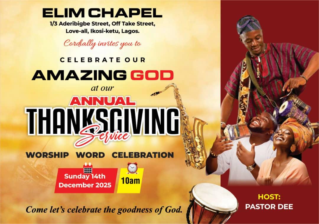 LAGOS: With the burden to see that Nigerians excel this last quarter of the year and land safely and successfully into the new year, despite the huge challenges confronting Nigeria presently, Elim Chapel, a Church with passionate vision Nigeria human and natural advancement, has concluded plans to hold a national thanksgiving service for Nigeria and Nigerians to thank God for His grace, mercy, divine protection in Nigeria today, and next year’s fortune.